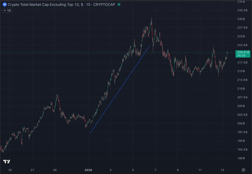 Altcoin berkinerja lebih kuat lagi. Seperti yang diilustrasikan pada grafik di bawah, pergerakannya menyerupai pembelian algoritmik (TWAP) tanpa henti hingga 6 Januari. Sejak mencapai puncak lokal tersebut, belum dapat dipastikan apakah kekuatan ini dapat dipertahankan. Meskipun peluang perdagangan long (beli) menyambut Tahun Baru kini telah berakhir, saya tetap optimis khususnya terhadap $BTC.