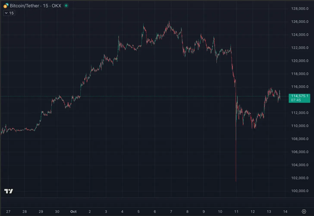 Pola ini terbukti lagi, karena Bitcoin menghadapi perdagangan yang berat setelah mencapai $126.000. Pada Jumat, 10 Oktober, tren penurunan semakin intens selama sesi perdagangan AS, dipicu oleh ketegangan geopolitik yang kembali muncul. Retorika bermusuhan Mantan Presiden Trump terhadap China, diikuti oleh pengumuman tarif 100%, menyebabkan penurunan tajam. Dalam hitungan jam, Bitcoin turun dari $122.000 menjadi $117.000, dan dalam jendela dramatis selama 30 menit, ia merosot lebih jauh menjadi $102.000. Penurunan cepat ini memicu kaskade likuidasi, yang berdampak parah pada altcoin, di mana banyak di antaranya mengalami penurunan melebihi 70% hanya dalam 10 menit.