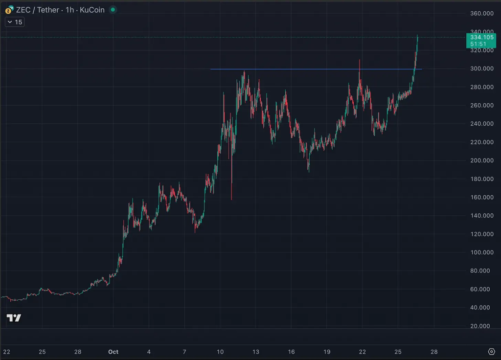 $ZEC mencapai $300 pada 12 Oktober, dan level ini telah menjadi resistensi yang kuat. Harga anjlok di bawah $200 pada 17 Oktober, kemudian mencoba menembus resistensi tersebut lagi pada 21 Oktober, namun ditolak, mencapai titik terendah di $225, dan akhirnya berhasil menembus $300 hari ini. Sekarang, $ZEC diperdagangkan pada level $315. Dua koin beta utama, $ZEN dan $DASH, juga mengalami kenaikan (meskipun secara keseluruhan jauh lebih lemah).