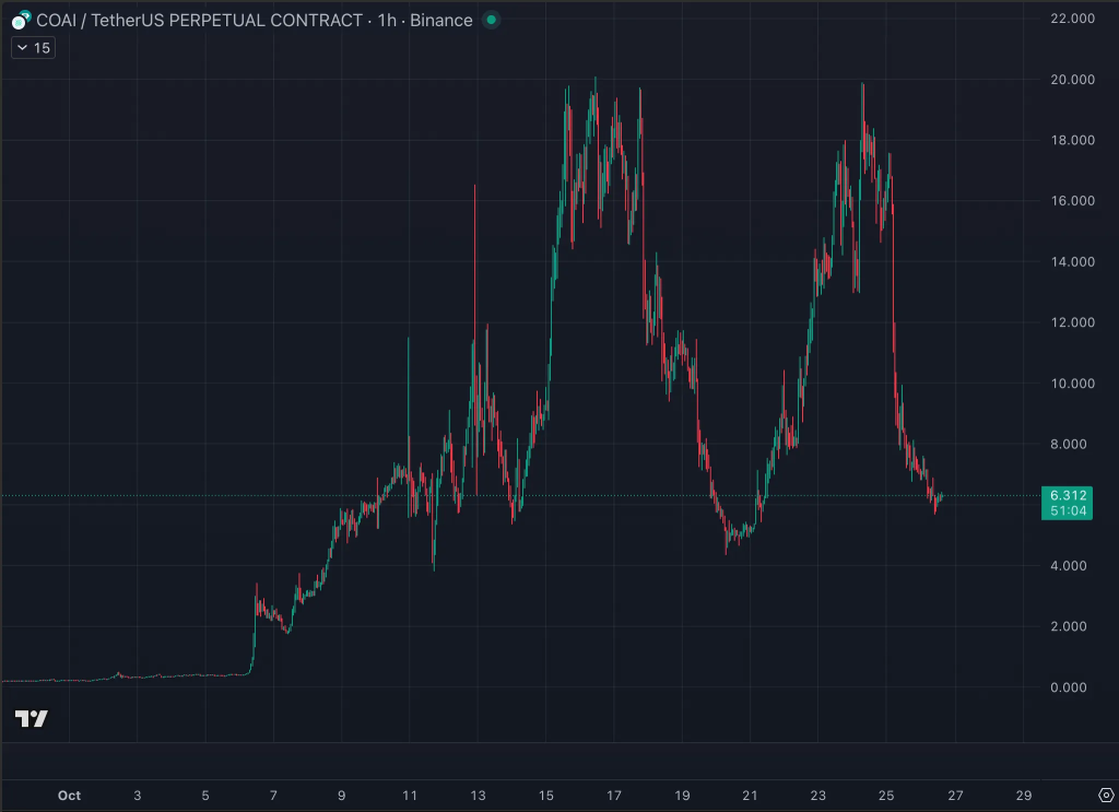Saya telah banyak membahas tentang $COAI pada edisi terakhir buletin ini. Lihatlah pergerakan harganya (perhatikan juga bahwa koin ini memiliki valuasi terdilusi penuh (FDV) sebesar $20 miliar pada harga $20):