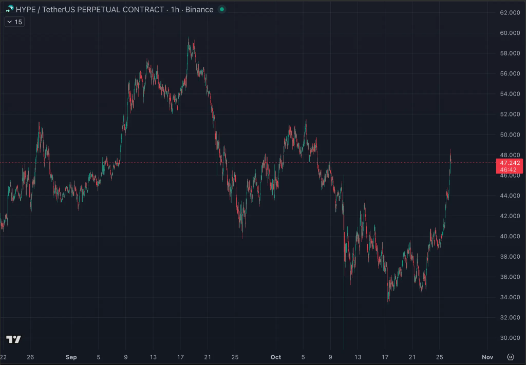 $HYPE naik +35% dari $35 menjadi hampir $48 hanya dalam tiga hari.