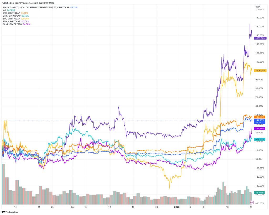 - GLMR (Moonbeam) dan LINK (Chainlink) menunjukkan gerakan terlemah dari daftar kami, hanya 34,58% dan 22,55% sejak hari-hari kolapsnya FTX