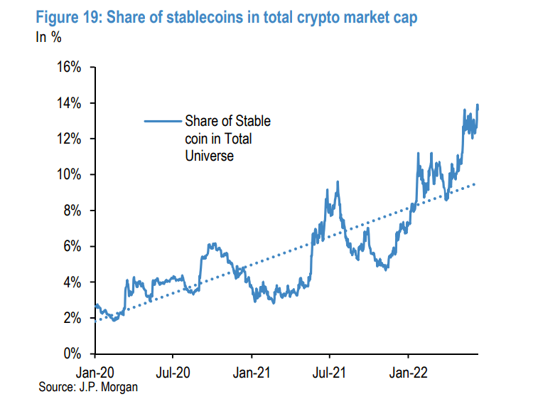 Walaupun demikian, ada satu skenario di mana ETH mampu terbebas dari saham teknologi dan dari pasar kripto lain, yaitu dengan stablecoins. Kalian semua sudah sering membaca tulisan kami dan menonton ulasan video kami, bahwa dolar AS (USD) telah meningkat tajam melawan hampir semua mata uang fiat lain. Pada saat yang sama, inflasi menyulitkan kemampuan rakyat kecil. Karena itulah, tidak mengejutkan ada banyak orang yang mulai beralih ke stablecoins dolar AS sebagai taruhan.