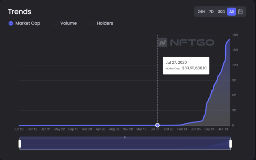 Kalau kalian ingat, market cap NFT melonjak dari 0 hingga $17 miliar hanya dalam setahun terakhir. seni generatif on-chain, Bored Apes, Milady’s, dan masih banyak lagi proyek lainnya mengalami peningkatan nilai hingga jumlah yang tidak diduga banyak orang.