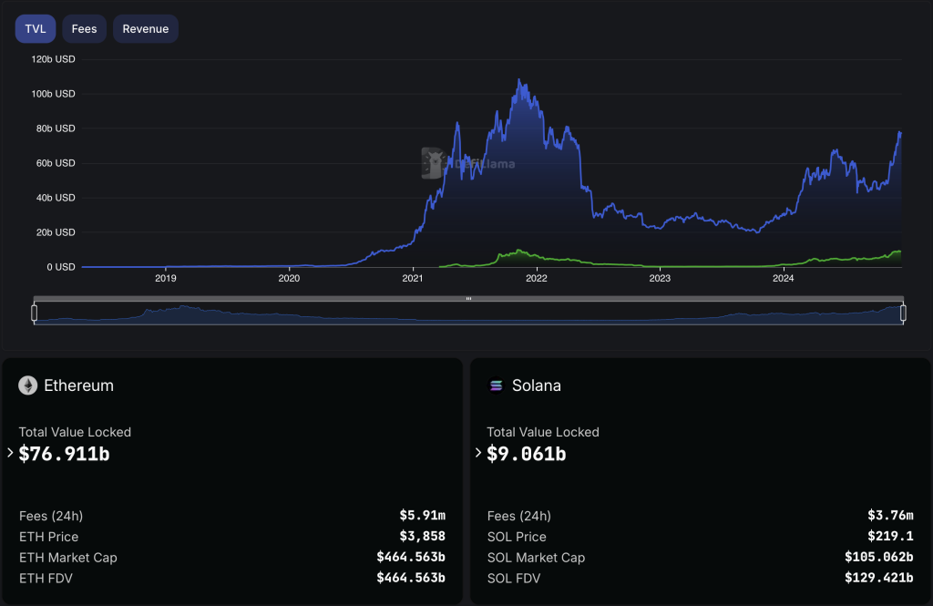 REV Solana menduduki posisi #1, lebih tinggi di atas Ethereum selama berminggu-minggu. Metrik onchain ini bukti Solana adalah ekosistem yang populer. Tapi kontras dengan angka TVL dan FDV, Solana hanya 12% dan 28% metriknya Ethereum. Ini tampak rendah bagi yang percaya masa depan Solana cerah.