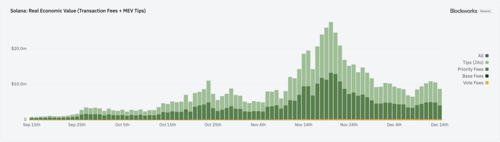 Kita bisa melihat bukti pertumbuhan ekonomi Solana dari REV (Real Economic Value). REV adalah cara terbaik untuk mengukur permintaan blockspace. REV mencakup biaya transaksi dan tip MEV, jadi tahu orang bersedia bayar berapa untuk menggunakan blockchain ini. Faktanya REV Solana lebih dari 2x lipat Ethereum itu keren. Tahun lalu masih kurang dari 1% REV Ethereum.