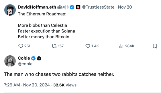 Komunitas Bitcoin juga punya visi yang jelas untuk menjadi sebuah uang, “emas digital”. Celestia punya visi yang jelas untuk melayani Rollups dan aplikasi. Ethereum diserang pada 3 hal ini: